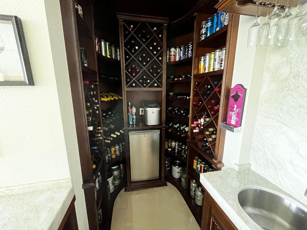 Salón de juegos con bar en ónix y cava para vinos, con hermosa vista al jardín